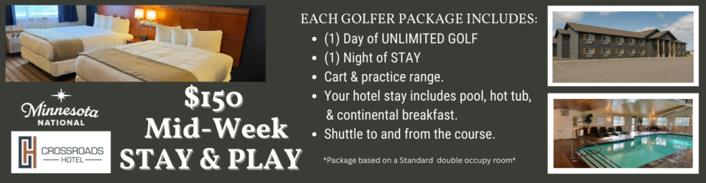Enjoy all the benefits of our popular Stay and Play Packages while staying at Crossroads.  Whether you’re planning a relaxing weekend for two, a golf trip with a foursome, or a large group outing with 20+ players, this package makes it easy to stay, play, and enjoy everything Minnesota National has to offer.